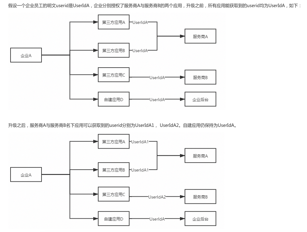 变化1解读:第三方应用为企业提供服务时,必须要与企业进行用户数据交互,交互唯一的桥梁就是上述的账号ID值。
