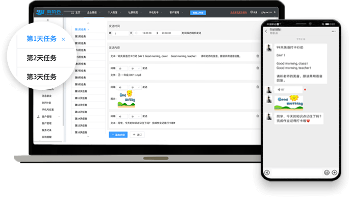 支持对社群或用户个人的SOP任务:第一天、第三天、第七天的推送策略,标准化的推送规则可复制到上百个群,上千名用户。